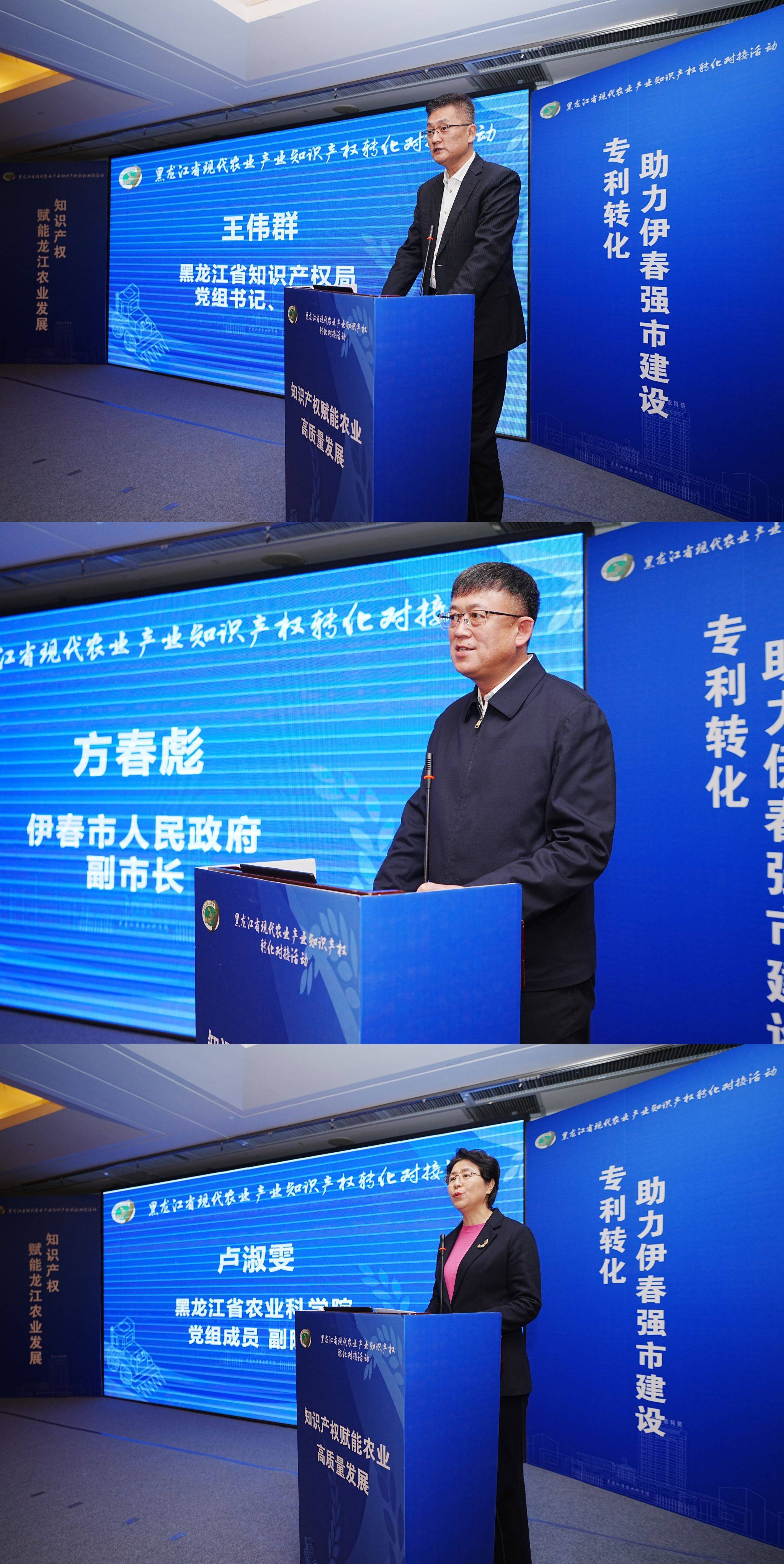 黑龙江省知识产权局党组书记、局长王伟群,伊春市人民政府副市长方春彪,黑龙江省农科院党组成员、副院长卢淑雯出席活动并致辞,活动得到了哈尔滨工程大学、黑龙江省科学院、黑龙江交易集团、黑龙江省生物产业知识产权运营中心的大力支持。