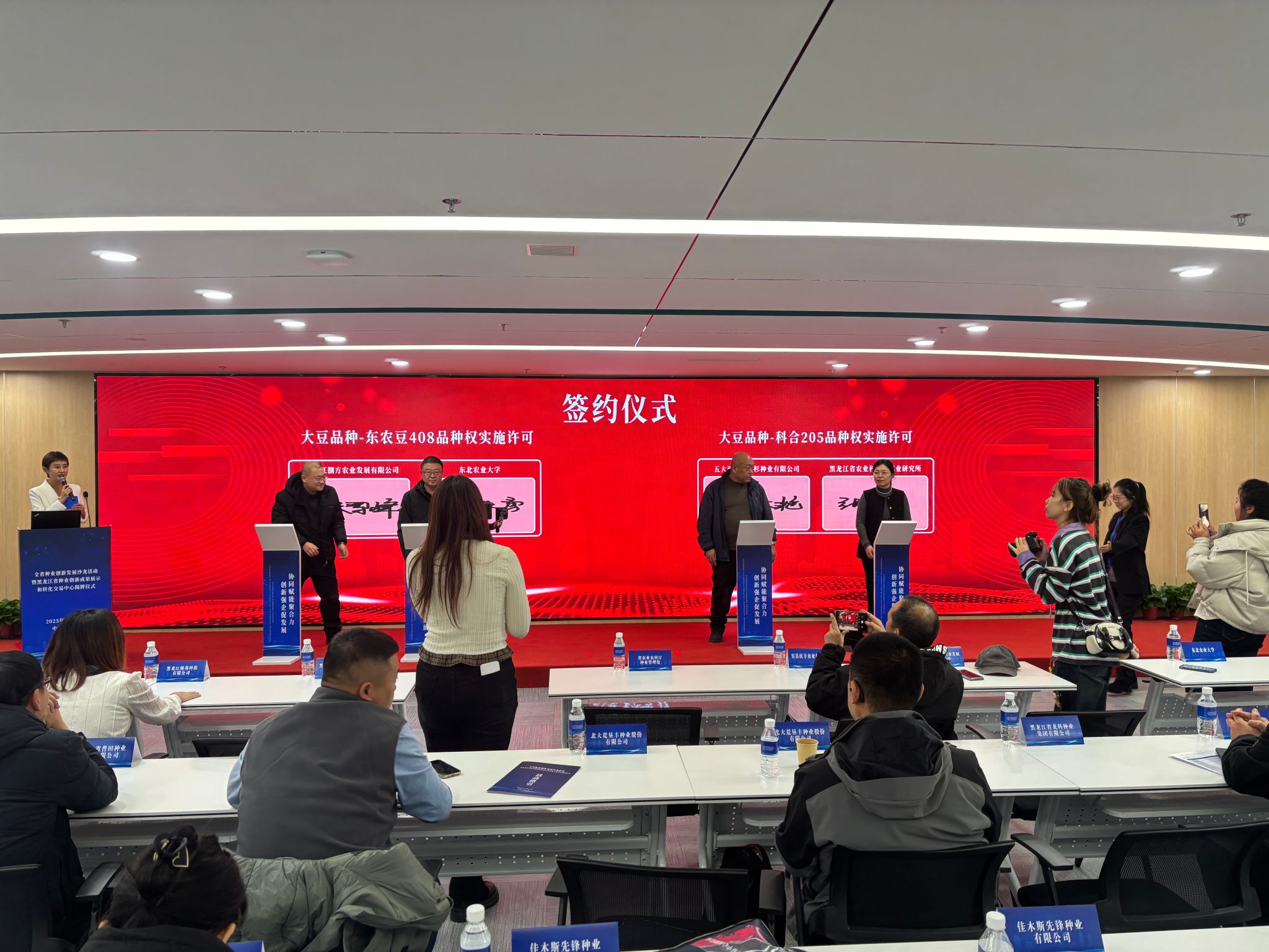 开幕式上,省农业农村厅副厅长姜以全、省农科院副院长焦少杰、新华社黑龙江中心主任王建共同为“黑龙江省种业创新成果展示和转化交易中心”揭牌。