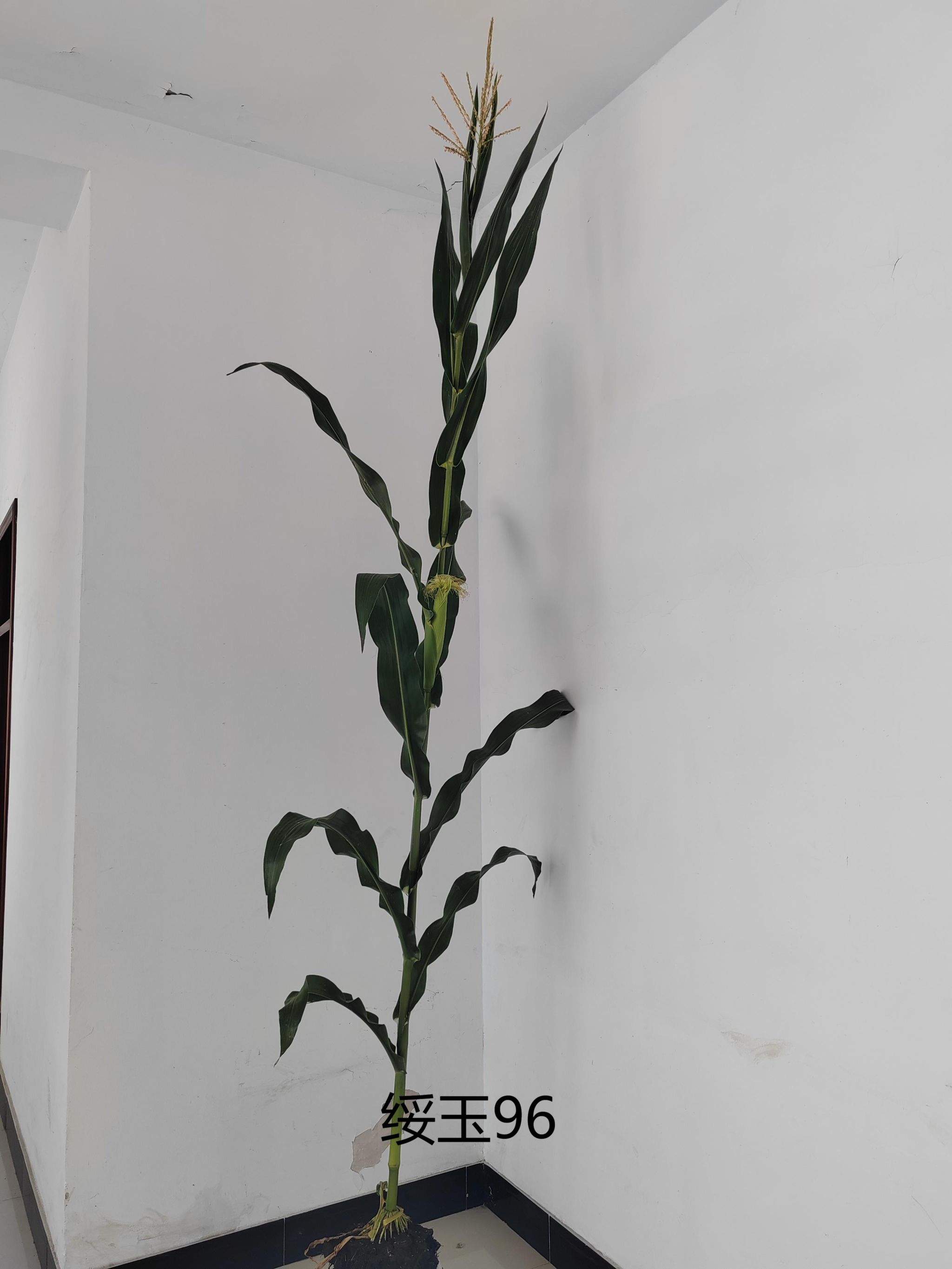 特征特性:绥玉96在适应区出苗至成熟生育日数为 120 天左右,需≥10℃活动积温2400℃左右。该品种幼苗期第一叶鞘紫色,叶片绿色,茎绿色。雄穗一级分枝 9~12 个,颖壳绿色,花丝绿色,花药绿色。株高306厘米,穗位高 123 厘米,成株可见15片叶。果穗长锥型,穗轴红色,穗长 20.0 厘米,穗粗 5.1 厘米,穗行数 14~18 行,籽粒马齿型、粒色黄色,百粒重 36.4 克。一年品质分析结果:容重 757克/升,粗蛋白 11.56%,粗脂肪 3.88%,粗淀粉 71.50%。两年抗病接种鉴定结果:中抗大斑病,丝黑穗病发病率10.3%~19.3%,茎腐病发病率 2.4%~4.5%,抗镰孢穗腐病。