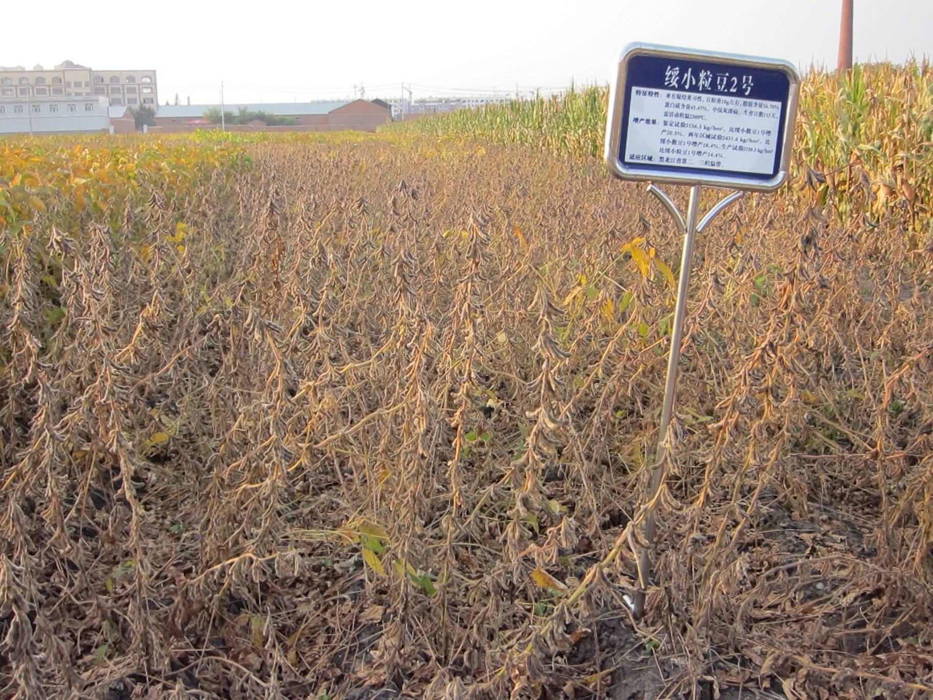 在适应区,出苗至成熟生育日数115天左右,需≥10℃活动积温2300℃左右。株高100cm左右,主茎节多,节间短,紫花,叶片是三出复叶、披针形,具有落叶性,灰毛,亚有限结荚习性。单株结荚密,三四粒荚多,荚微弯镰形、成熟时呈褐色、不炸荚。籽粒圆形,种皮黄色有光泽、不裂皮,种脐浅黄色,子叶黄色,百粒重10克左右。蛋白质含量45.47%,脂肪含量16.70%。接种鉴定,该品种属于中抗灰斑病类型。
