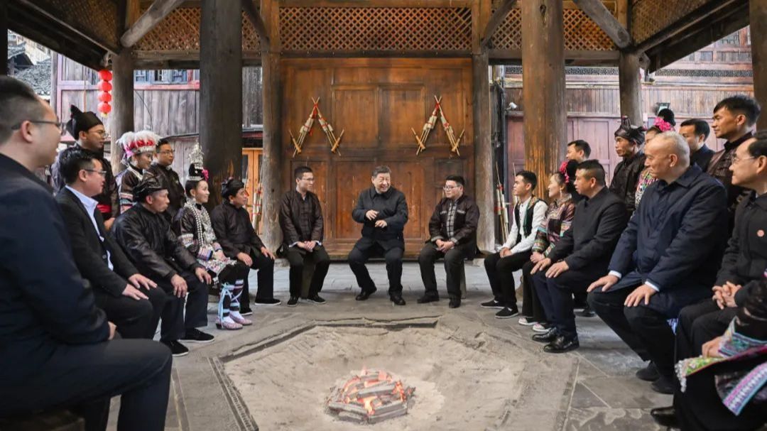 习近平在贵州考察时强调坚持以高质量发展统揽全局在中国式现代化进程中展现贵州新风采蔡奇陪同考察3月17日至18日,中共中央总书记、国家主席、中央军委主席习近平在贵州考察。这是17日下午,习近平在黔东南州黎平县肇兴侗寨考察时,同村民们亲切交流。新华社记者 翟健岚 摄3月17日至18日,中共中央总书记、国家主席、中央军委主席习近平在贵州考察。这是17日下午,习近平在黔东南州黎平县肇兴侗寨考察时,在信团鼓楼同村干部和村民代表围坐在火塘边,...
